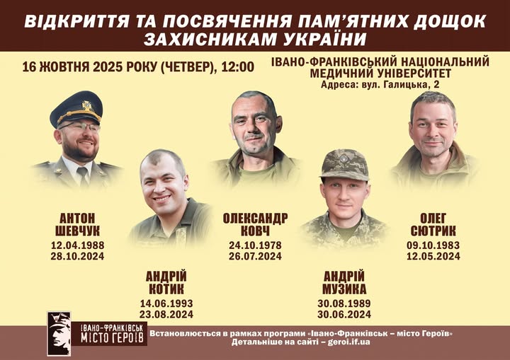 Завтра, у четвер, 16 жовтня, о 12:00 год в Івано-Франківську відбудеться пам’ятний захід, присвячений вшануванню ще п’ятьох медиків, випускників Івано-Франківського національного медичного університету (ІФНМУ), які загинули, захищаючи Україну. Про це […]