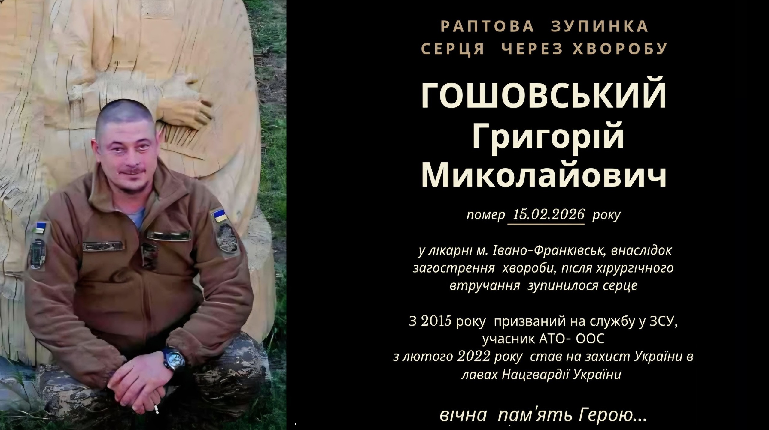 В Івано-Франківську 15 лютого 2026 року в лікарні помер захисник України Григорій Гошовський.