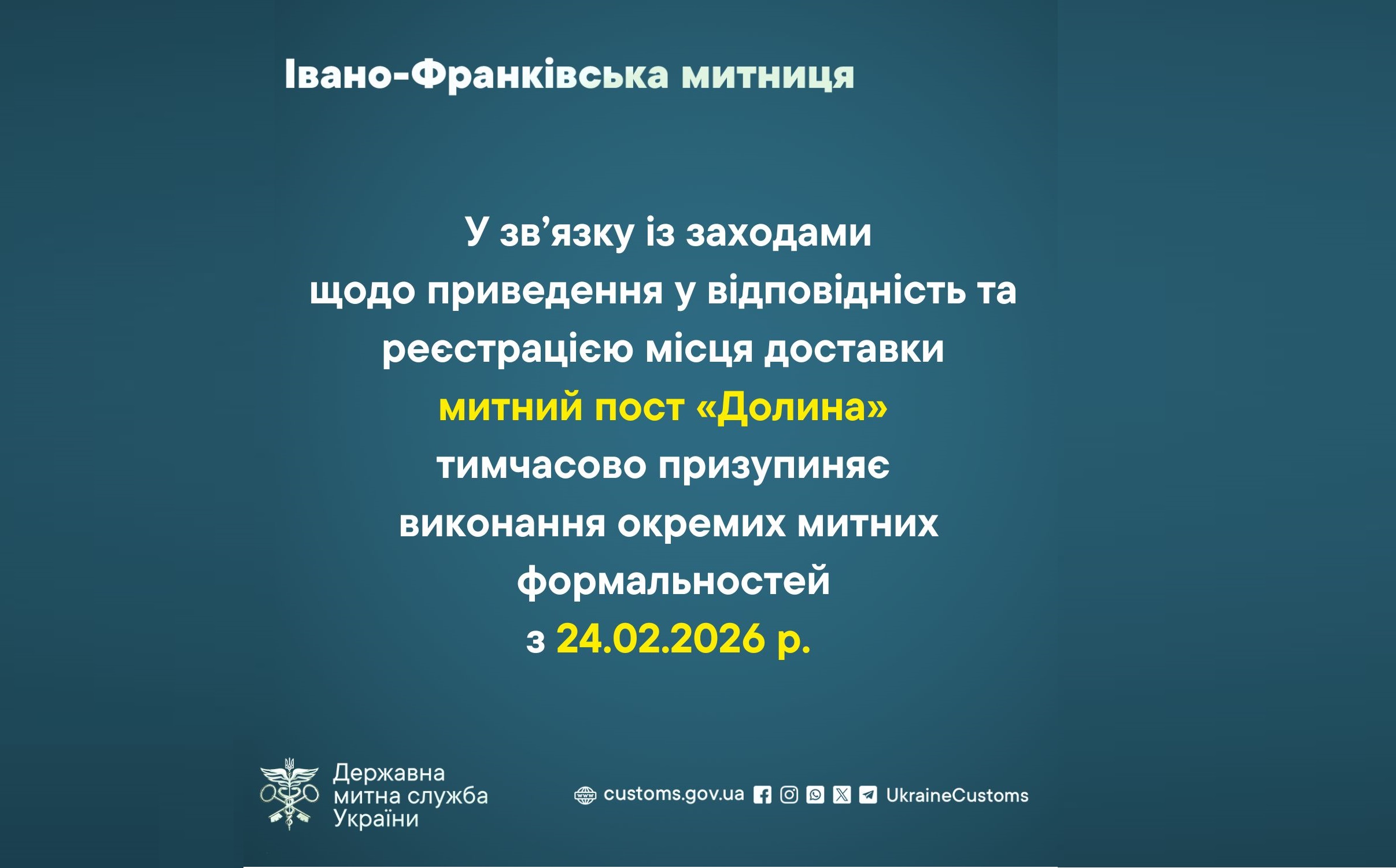 У зв’язку із заходами щодо приведення у відповідність та реєстрацією місця доставки митний пост «Долина» тимчасово призупиняє виконання окремих митних формальностей з 24.02.2026.