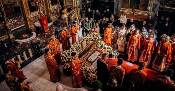 Під час обходу святині духовенство процесійною ходою несло Плащаницю, а за ними з сумом слідували вірні, вшановуючи Пречисте Тіло Господнє.